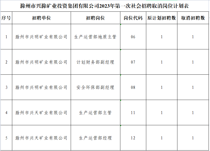 根據《滁州市興滁礦業(yè)投資集團有限公司2023年第一次社會招聘公告》規(guī)定,經對各崗位報名情況篩查審定,部分崗位報名情況未達到開考比例,經研究決定取消以下崗位招聘計劃: