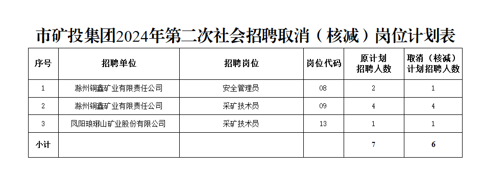 根據(jù)《滁州市興滁礦業(yè)投資集團(tuán)有限公司2024年第二次社會招聘公告》規(guī)定,經(jīng)對各崗位報(bào)名情況篩查審定,結(jié)合資格復(fù)審情況,部分崗位報(bào)名情況未達(dá)到開考比例,經(jīng)研究決定取消(核減)以下崗位招聘計(jì)劃: